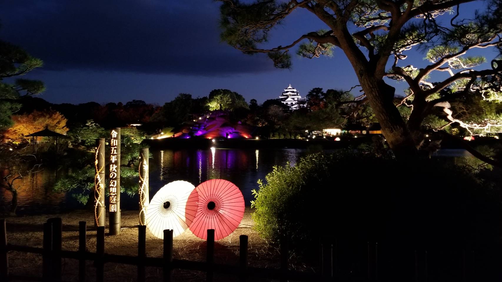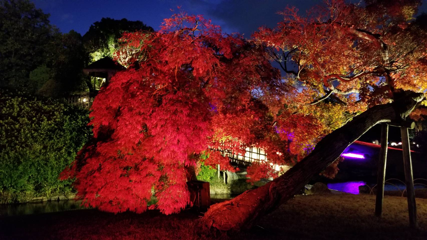 岡山の友達が年間パス持ってるから良く行くよ!て言ってましたが納得。この日は半袖でもいいぐらいで、欧州観光客の方も多勢見えてましたし、結婚式の写真撮りで赤の打ち掛けの美しい花嫁さんも見れて良かった~🌹1時間程庭を眺めてました。確かに癒やされる🥰写真のライトアップは友達が送ってくれました。