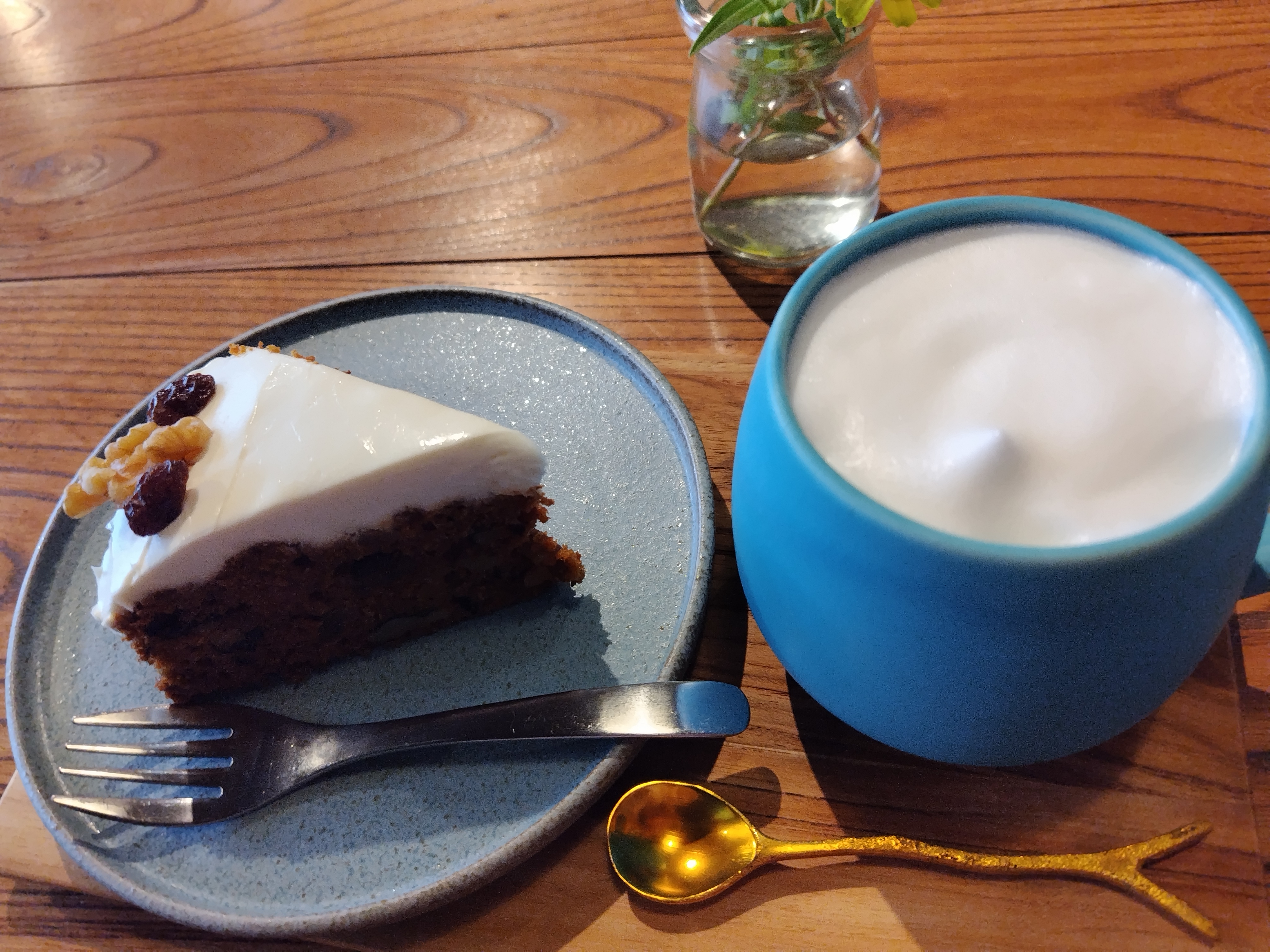 ウォーキング目的で古い町並みを探索!かわいい身体に優しげなCaffeを見つけて、しばしの休憩TIME☕Caffeオレがめちゃ美味しくて、ケーキも追加。糖化は歩いて解消しました。