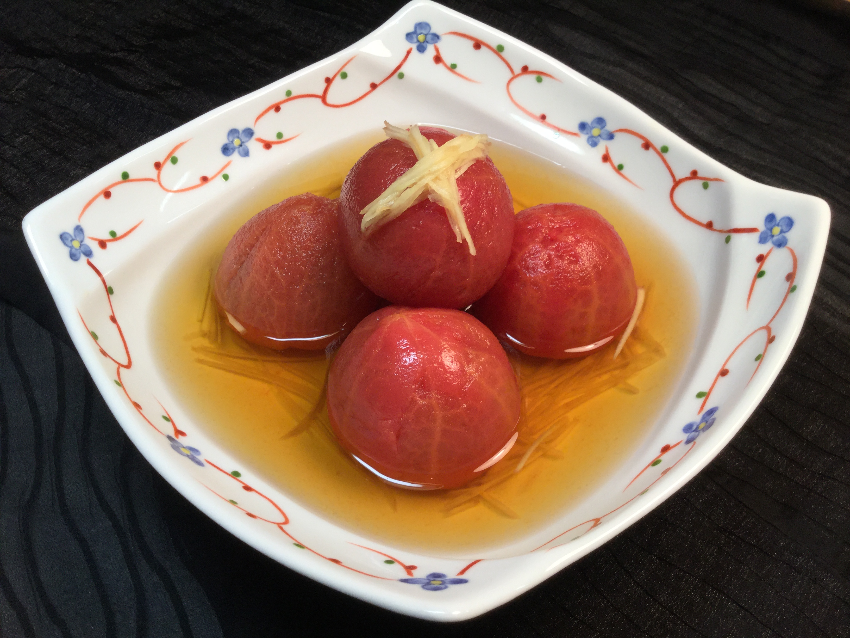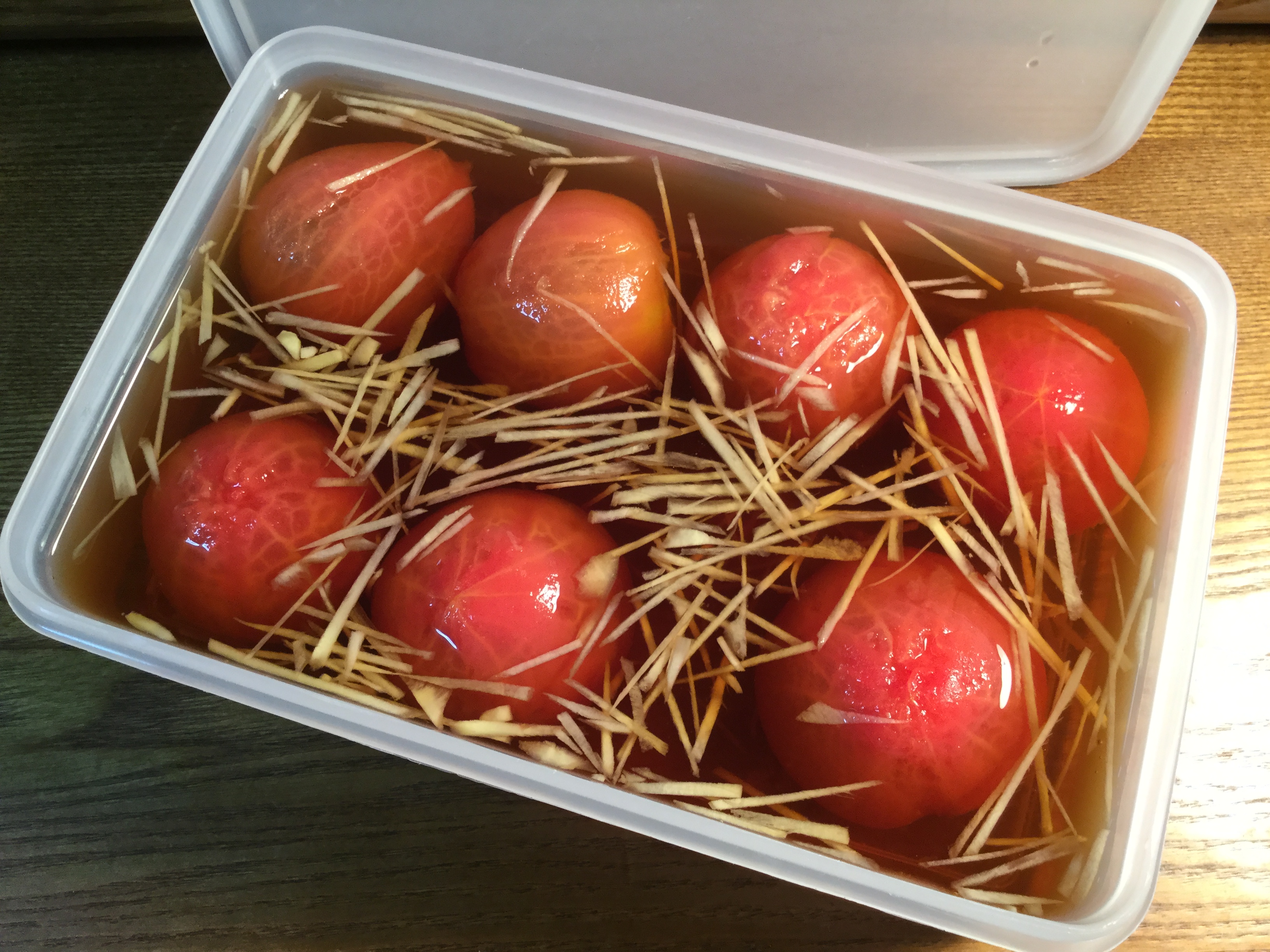 だし汁にトマトと針生姜を入れ、冷蔵庫で