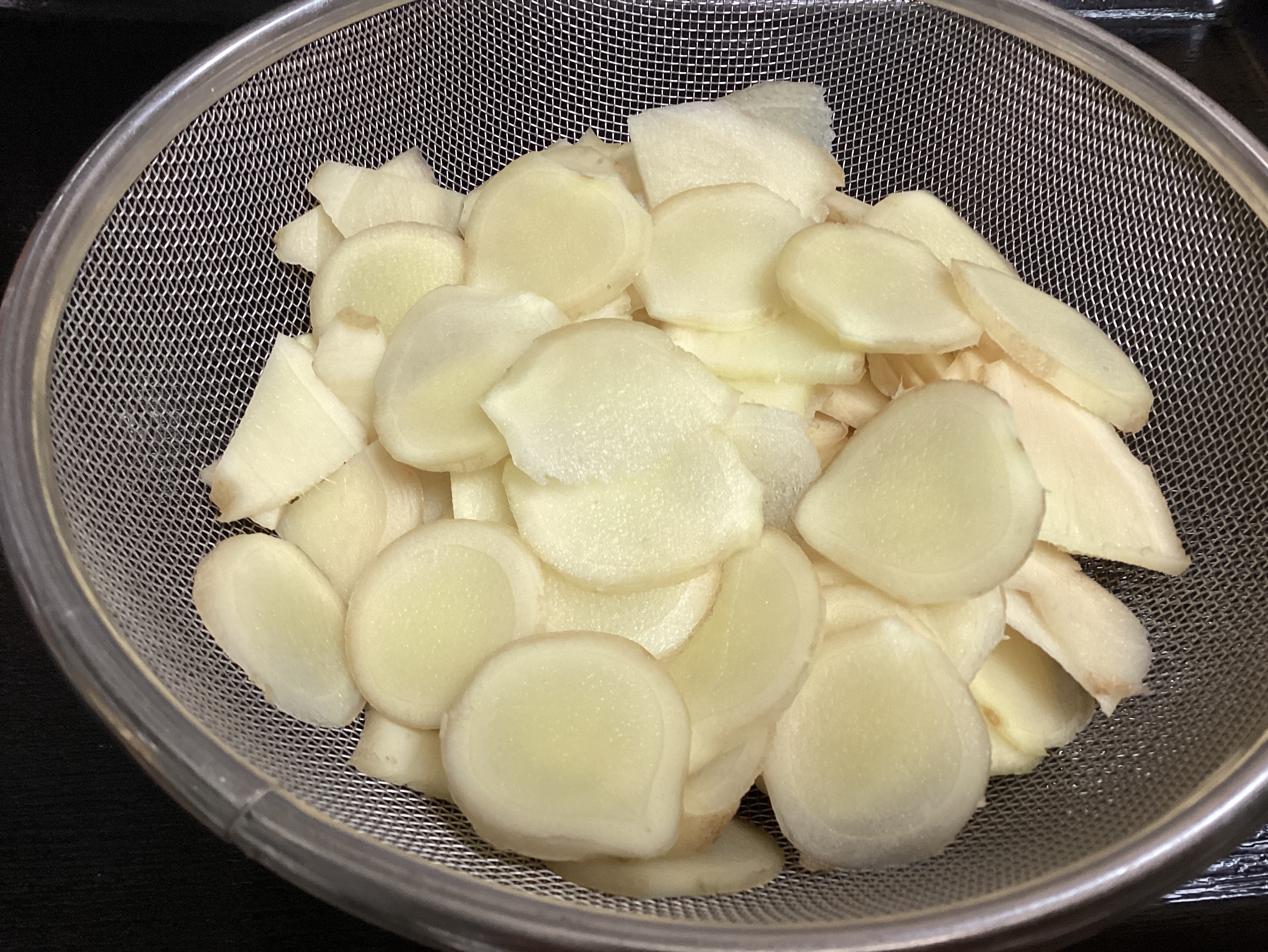 たっぷりの熱湯で、生姜を1分ほど茹でて、水