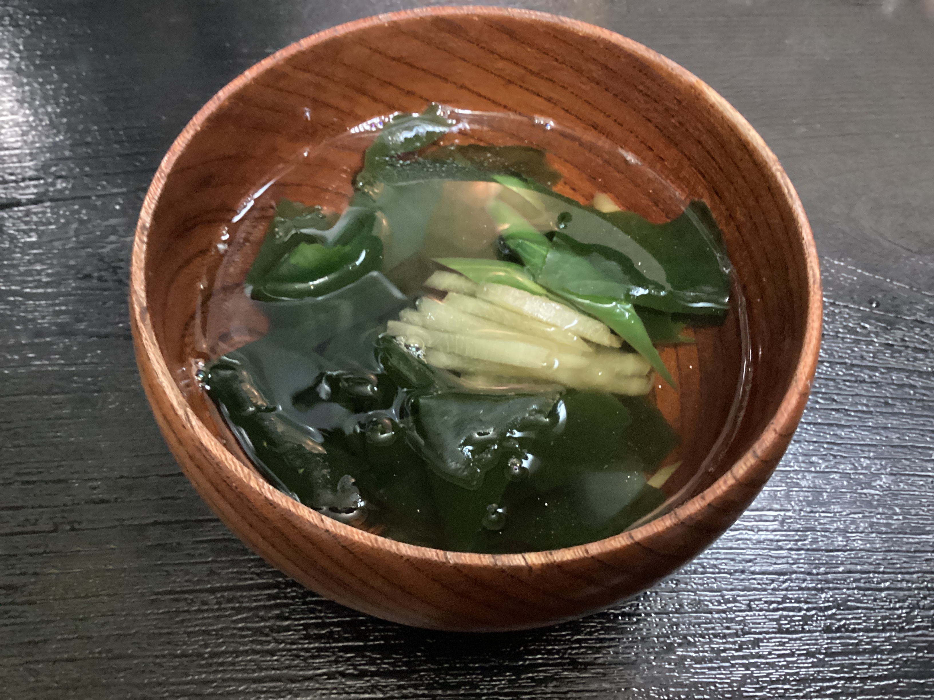 ワカメ、カツオ粉、醤油、千切り生姜に熱湯注ぎ