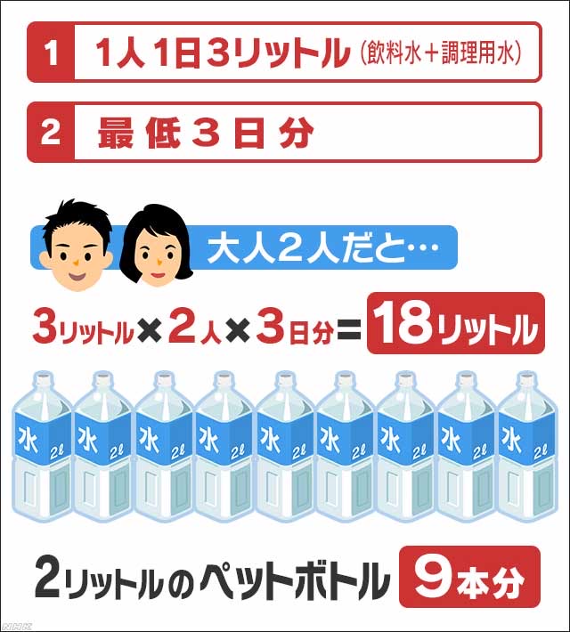 備蓄の基本は『1人 1日 3ℓ、最低3日分』